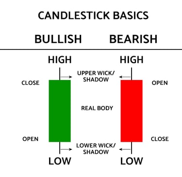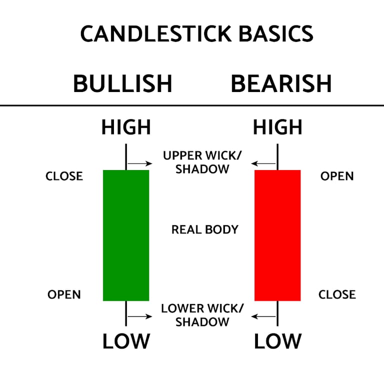 Candles consist of a body (difference between open and close) and wicks (high and low prices during the candle’s life).